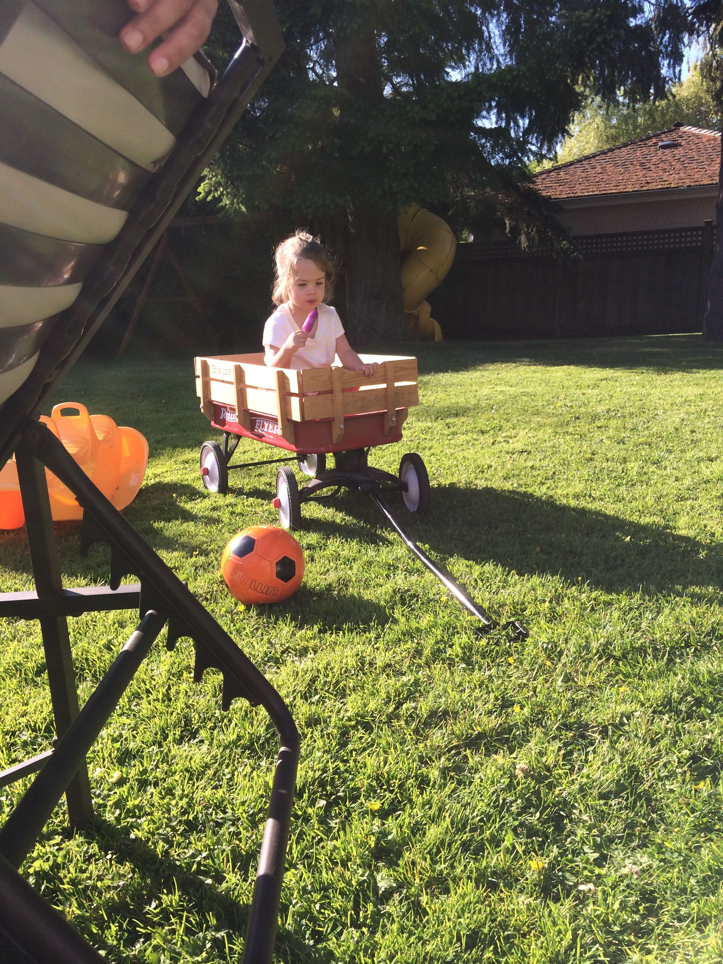 Sometimes I’ll catch one of them mid-imagination – and that’s my favorite. I have no idea what Charlie was thinking but as she slurped her favorite purple Popsicle after dinner one night she started talking about “puppy gogs” and dragged the wagon to the grass and then got in and sat there for a good 5 minutes telling herself a story. Love their little brains.