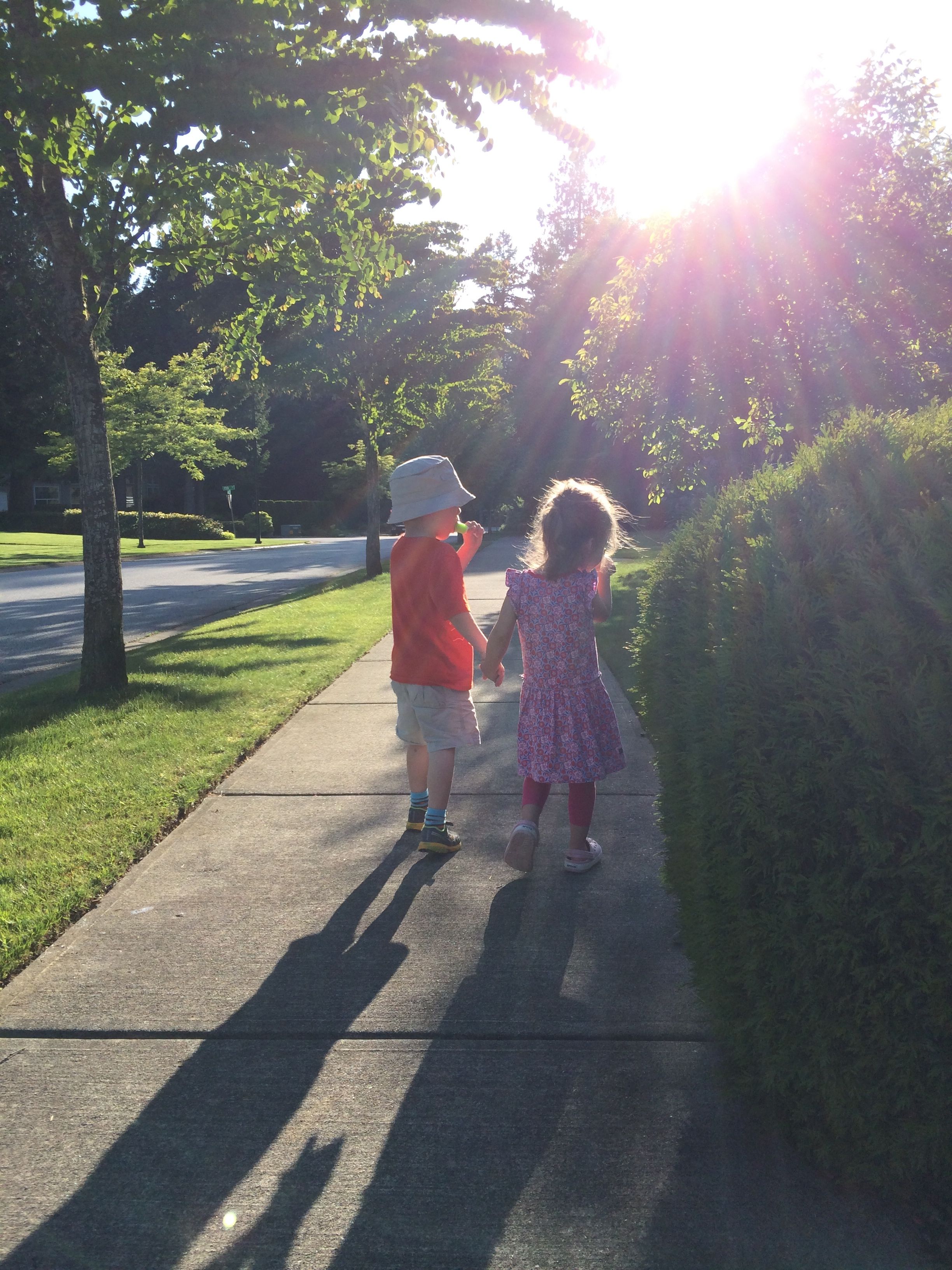 This week we’ve eaten outside every night; on the deck, on the grass, at the beach, at the table, walking, sitting in a wagon … you name it. It’s so fun to see m&c&k enjoying outside as much as i do. sometimes by force or Popsicle bribe but hey… whatever works. Each night after dinner we hit the beach for ice cream, or walk around the neighbourhood noticing bugs and animals, racing to light posts and imagining the forest paths are enchanted.