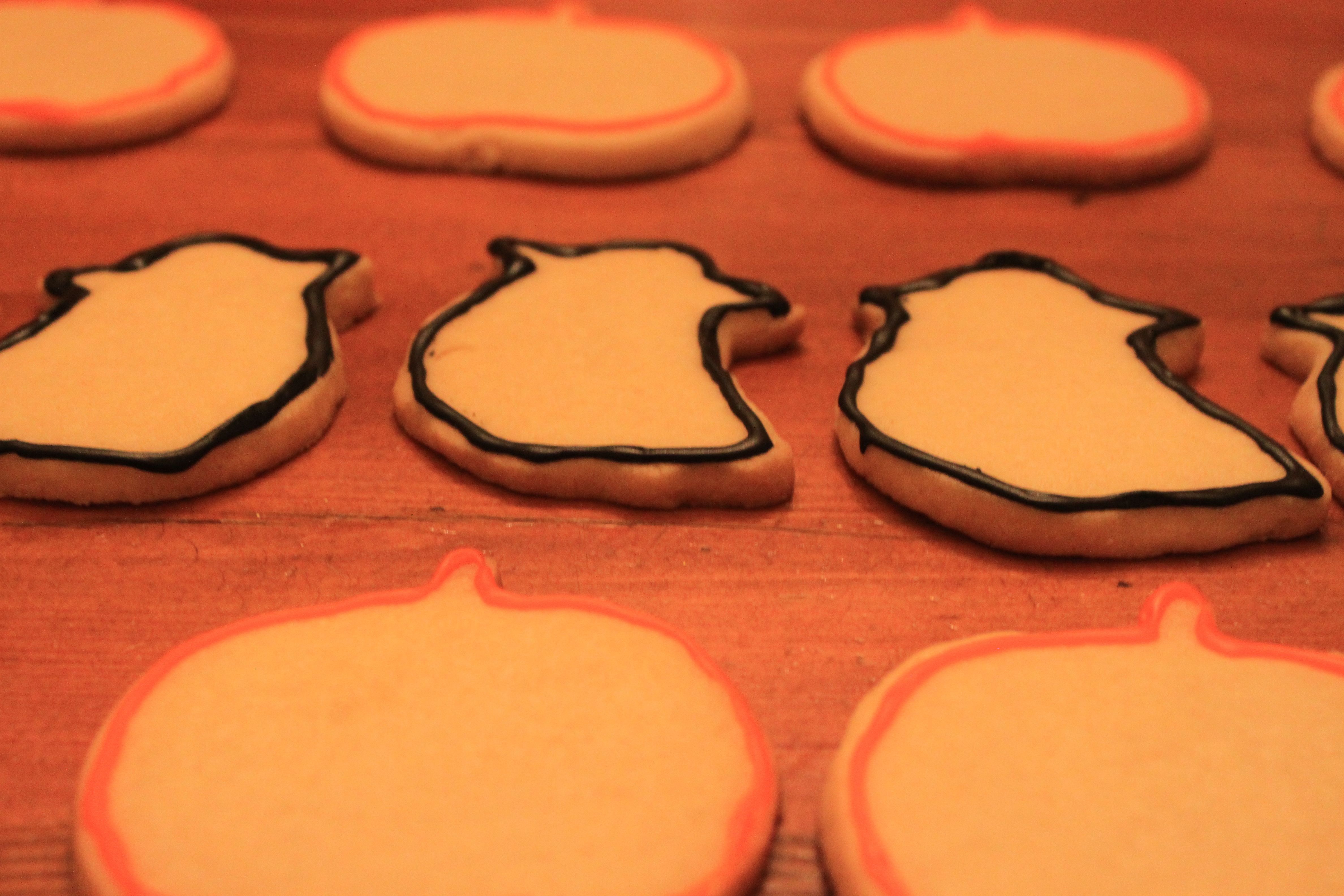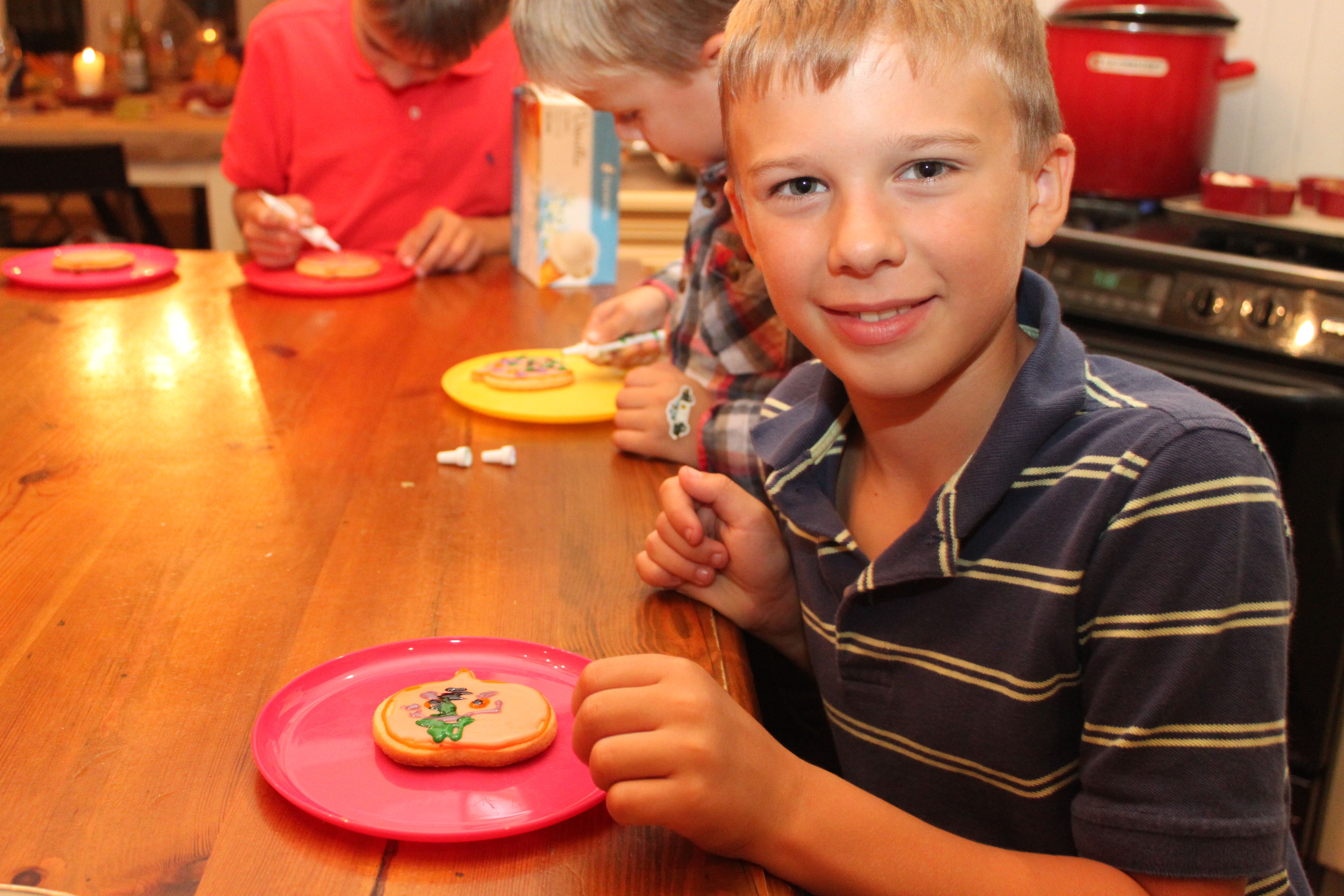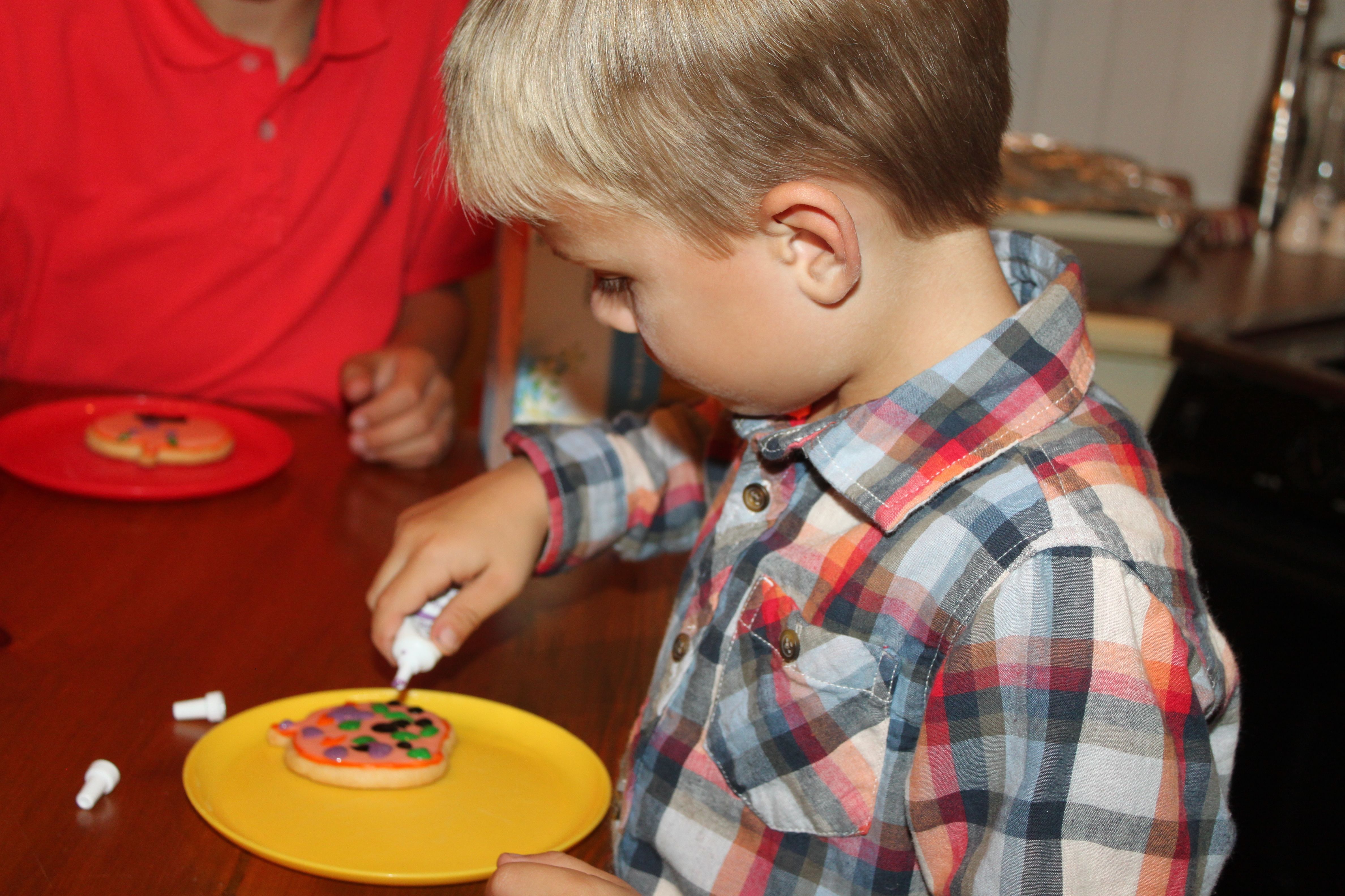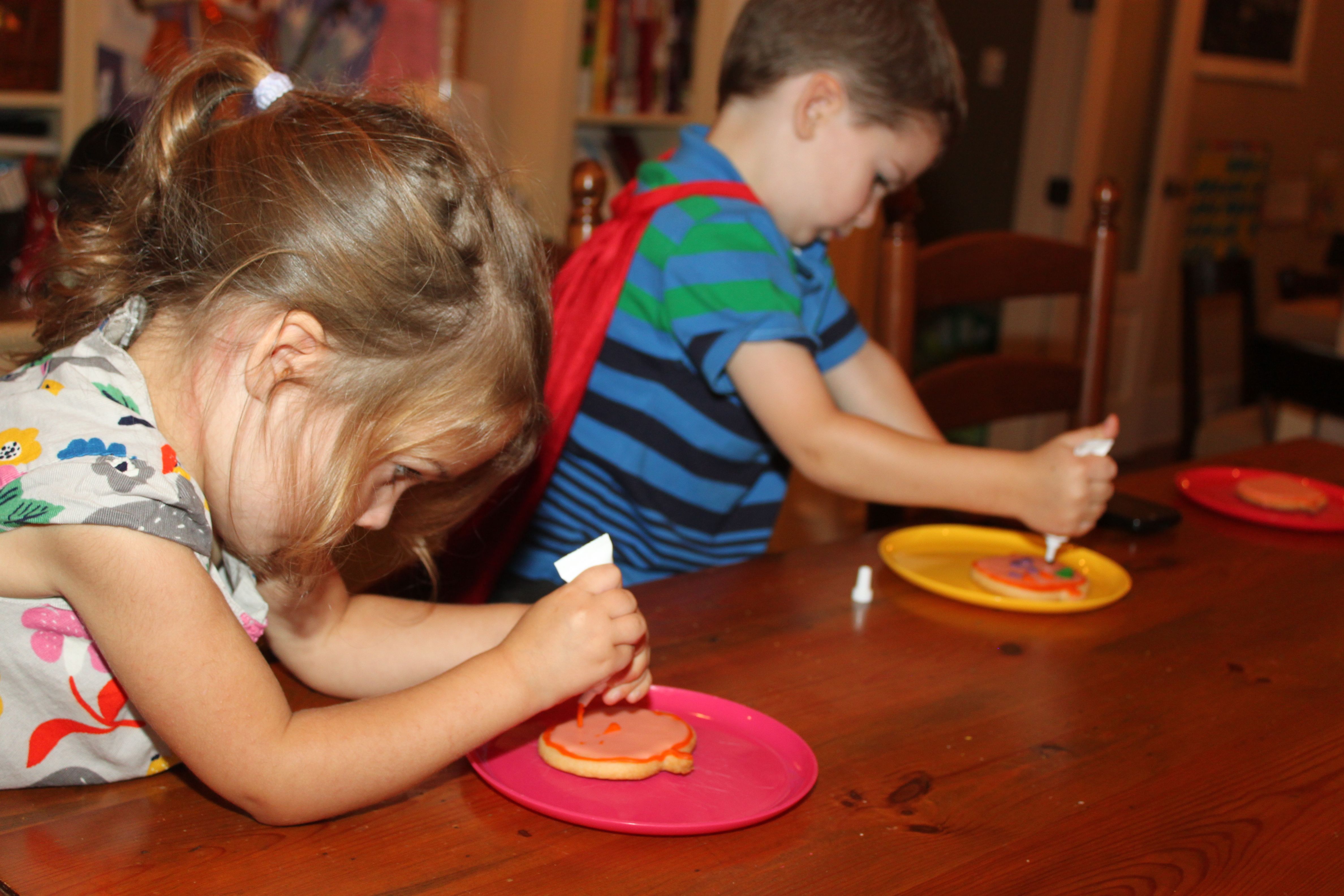 3. cookies. Related to cupcakes but not exactly the same… We made 3 batches of pumpkin sugar cookies this month. They are great for a quick activity when friends are over, and for a time-user when you need to clean up after dinner and not referee kid battles. I made the basic dough and froze it in batches to bring out throughout the month. The icing faces got scarier and more elaborate as the month went on… and by that I mean there was more icing used because they wised up to the fact that the more they decorated, the more icing they got to lick off the cookie before giving the rest to daddy as a special gift.