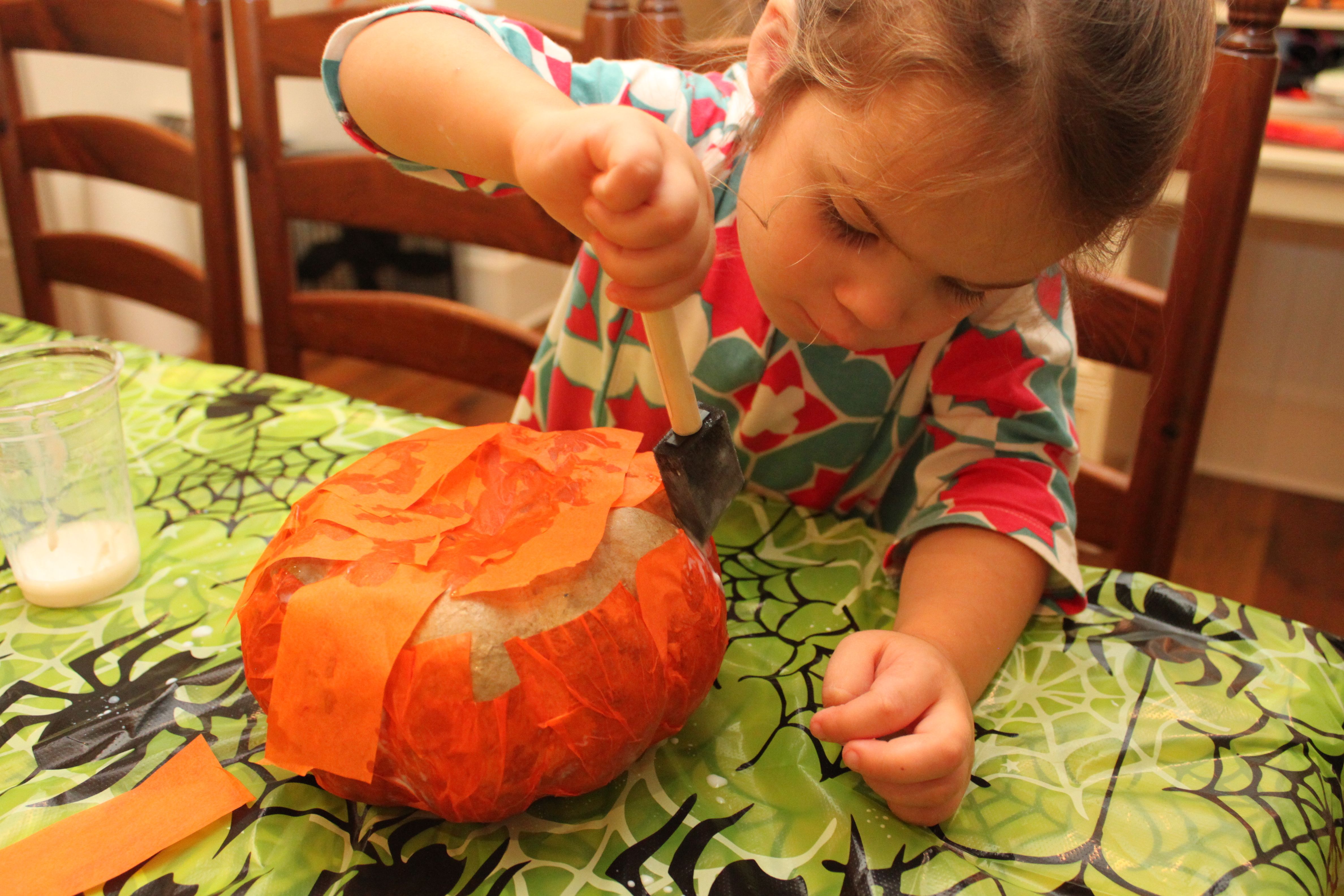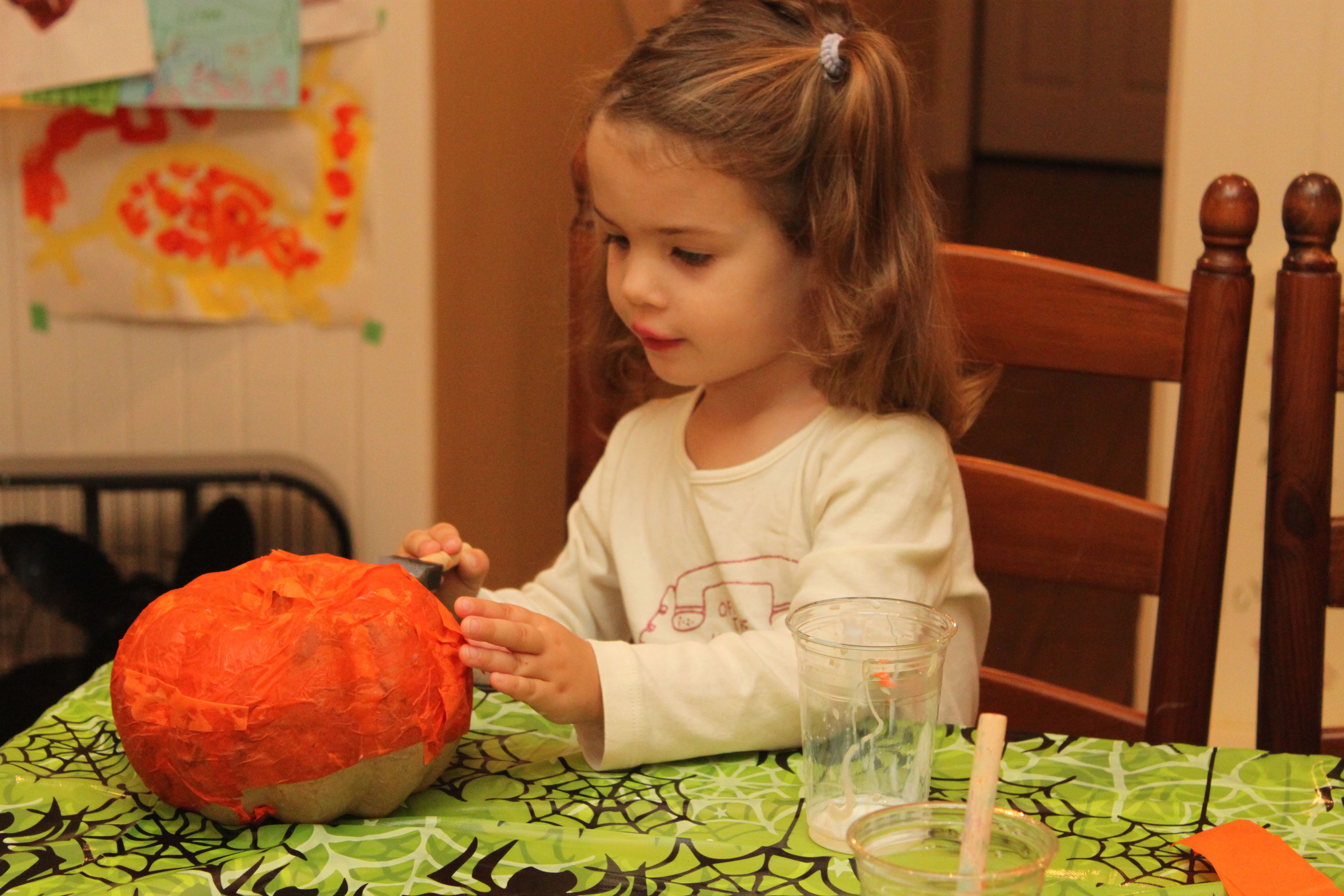 1. paper-mache pumpkins. This one is not expensive at all, and takes a good 45 minutes. It’s a bit messy – so haul out the newspaper or a plastic table cloth – but super fun. Made using a basic Michaels cardboard pumpkin with orange tissue paper cut into small pieces and kid’s glue that I added water to with foam brushes from the dollar store. The girls had a blast pasting their way to a creative pumpkin. They refused help and both had their own style to get to the finished product… and those pumpkins have been front and centre on our table every night since they were so lovingly made.