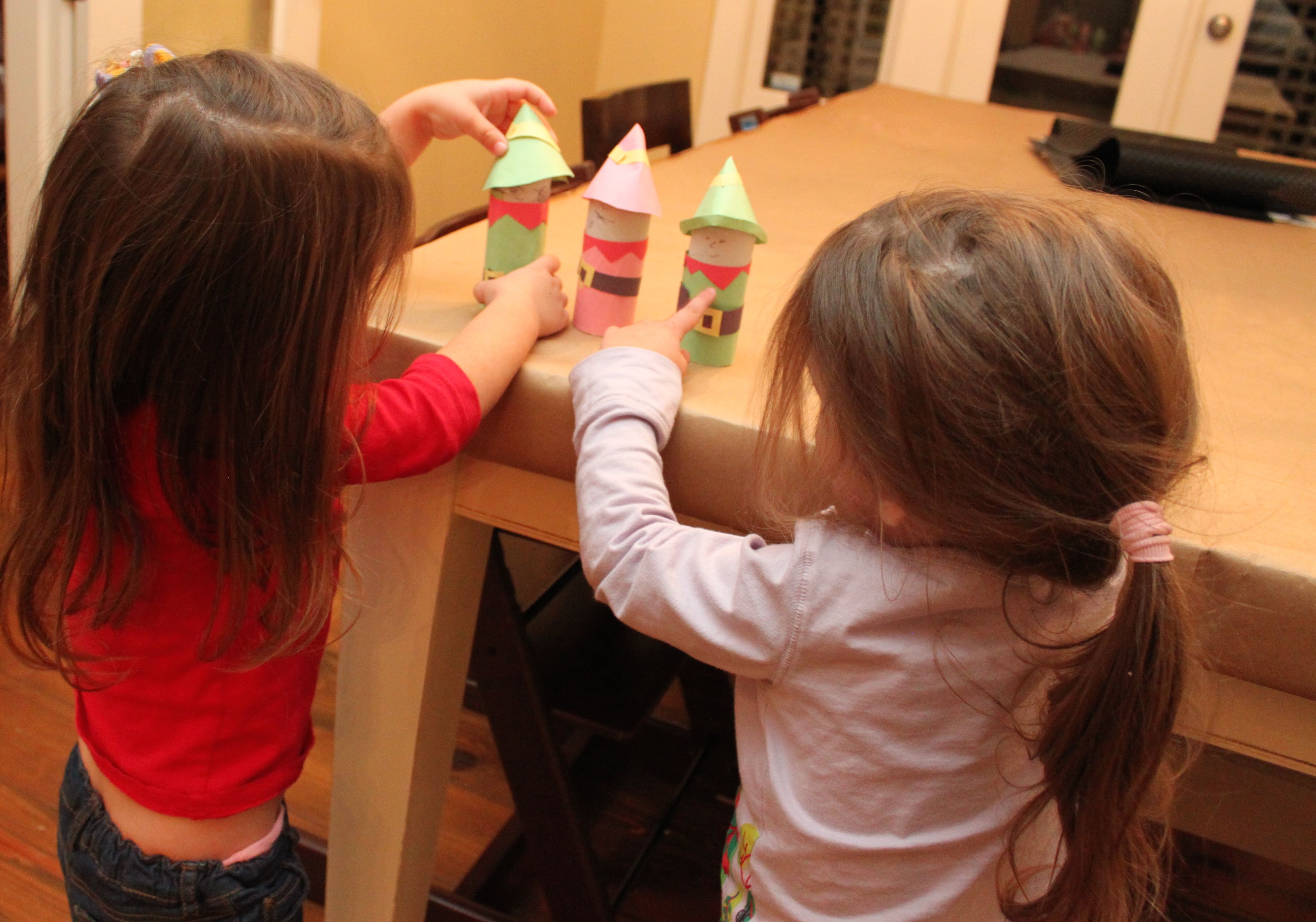 So this Christmas, because we’re so busy all the time, we decided to do two special things as a family each day. The first is read a new story each day as a sort of a different version of an advent calendar (I’ll post about that later). The second is a Christmas craft each day. On the first day the kids made little elves out of TP rolls.