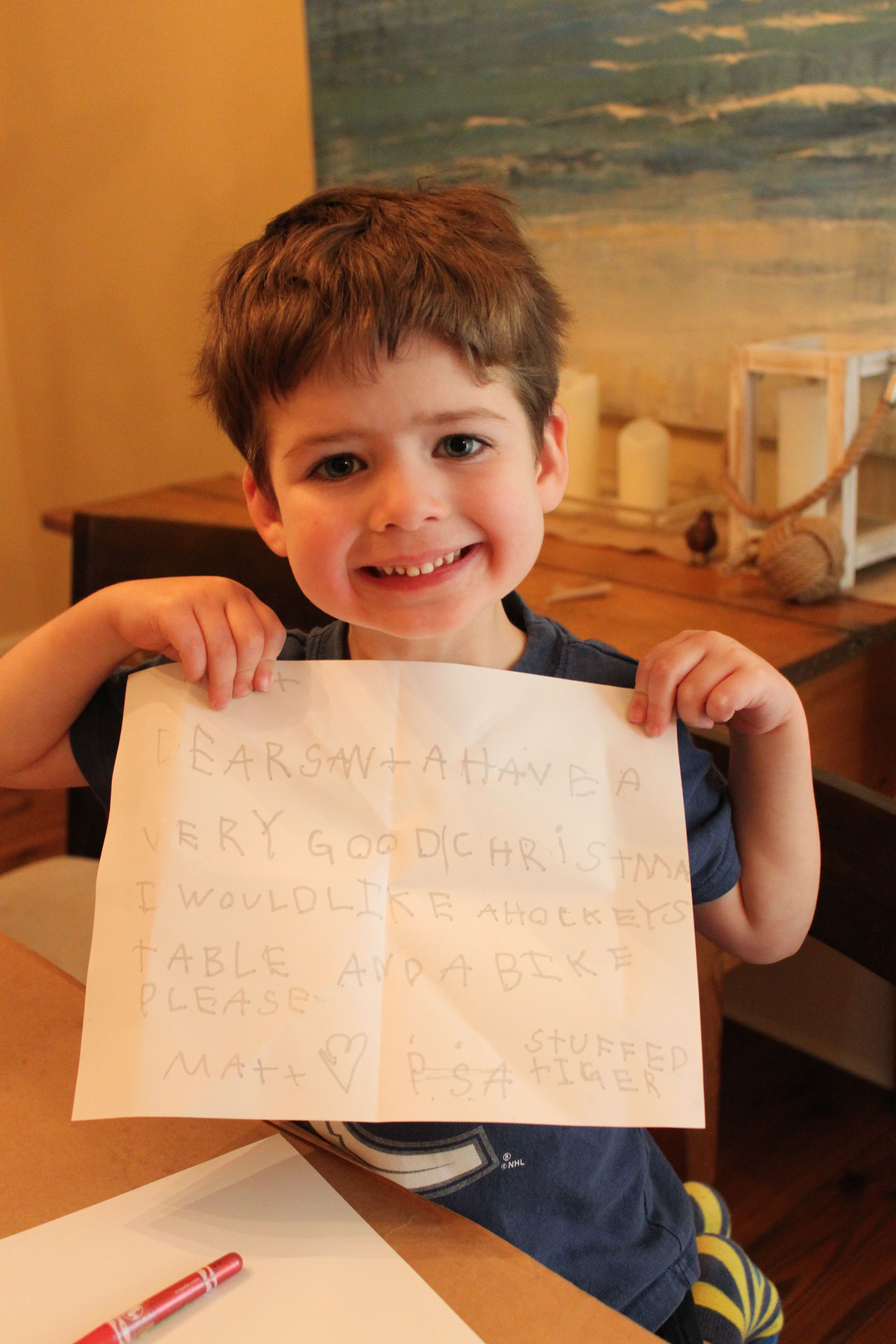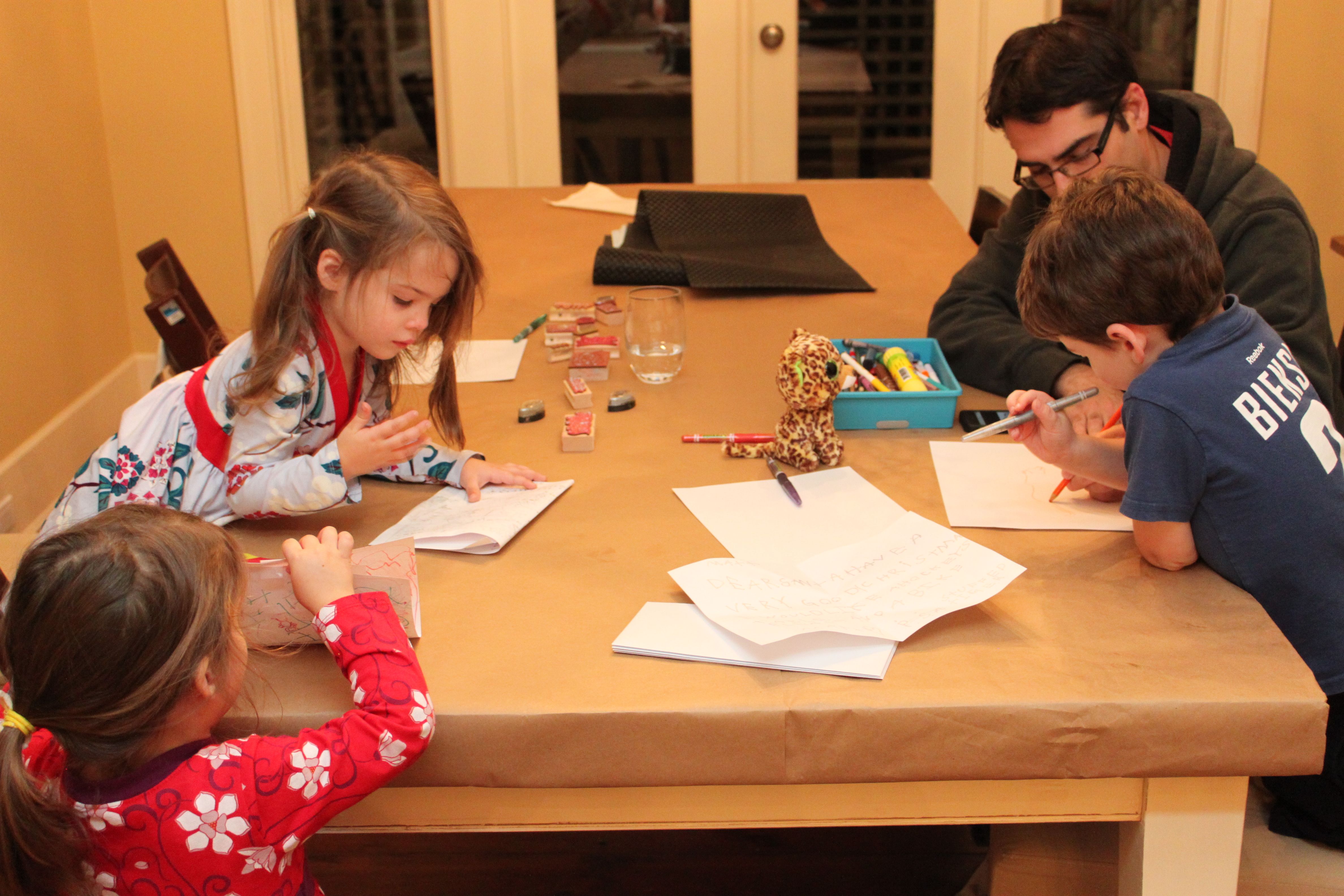 On the second day we took out all my Christmas stamps and created our own letters to Santa. They all took the stamping very seriously. Matt was determined to write his letter himself. He wanted to make sure he told Santa to have a good Christmas and he thought it would be important to write in silver so that Santa would enjoy reading his letter. Cam helped him spell some of the words and Matt was thrilled to be such a big boy making his own letter. The girls followed suit – writing “abcds” – as they called them – to Santa. Unfortunately I wasn’t sure if the Santa would be able to read the girls letters (even though they talked out loud as they “wrote” each word “dear santa… I like you Santa…i want a” So I asked them if I could write a translation for them on the other side just in case, they held the markers with me as we re-wrote all of their words into something Santa might better understand. They folded up their letters – licked their envelopes and put them on our desk and tonight we’ll go and mail them together. They literally danced upstairs to bath time afterwards.