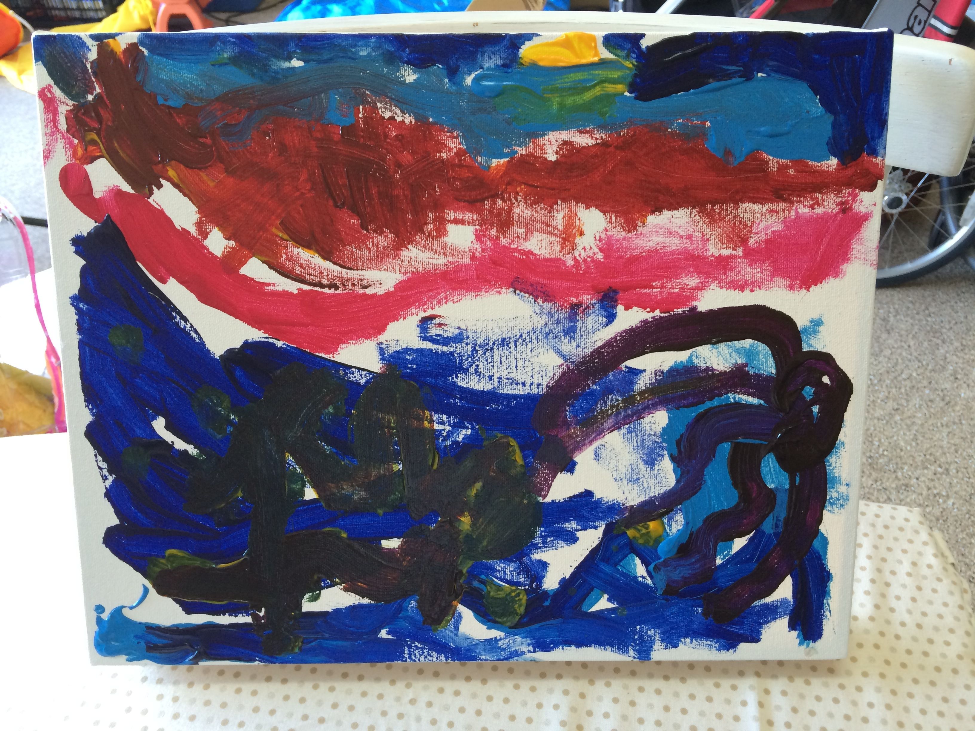 Kate decided she was painting a red butterfly – and then loved using the water on her brush and then loved the look of mixing colours, and she just kept painting layers and colours until every tiny spec of the canvas was covered.  She looked at it when she was done and noted that it was a butterfly in the blue sky above the trees with the sunshine.  Completely satisfied in her creation – and the last one to put down her brush.  Her masterpiece took three days to dry.