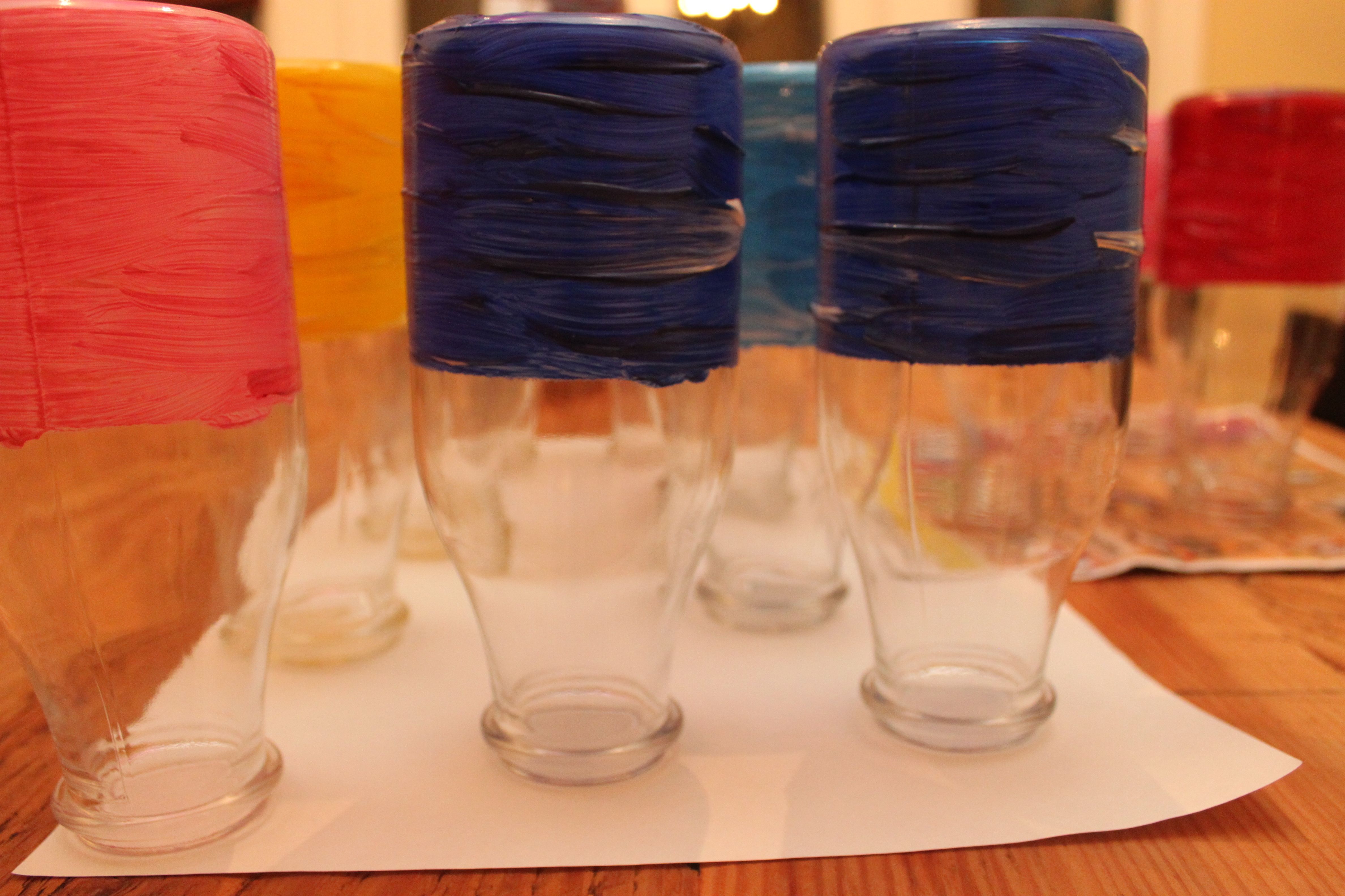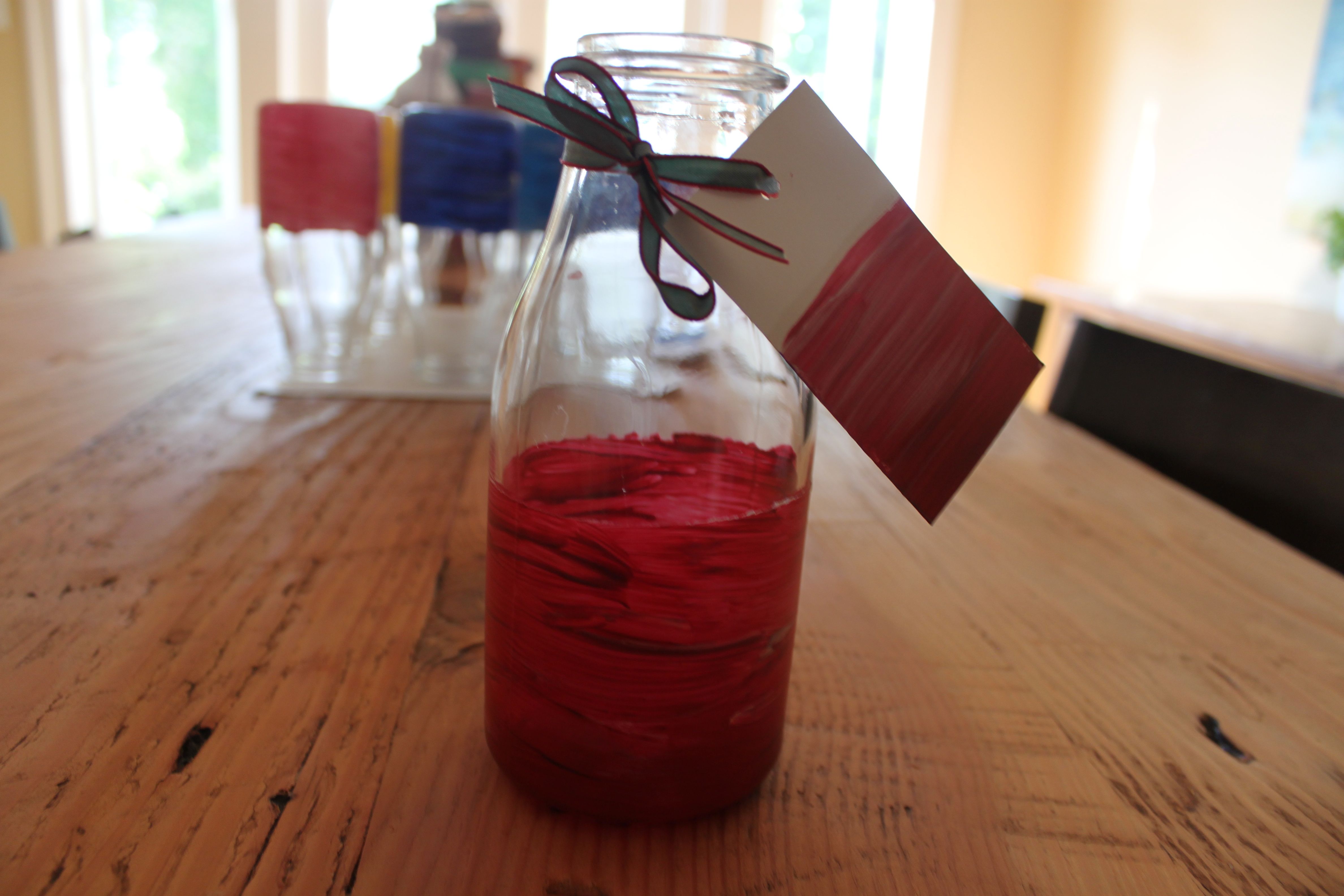 My brother and sister-in-law did most of the work of arranging for rentals and the catering so it left me with the very happy job of just making the table look pretty.  One small art project was painting small ikea vases with her favorite colours, and then painting tags to match each one.