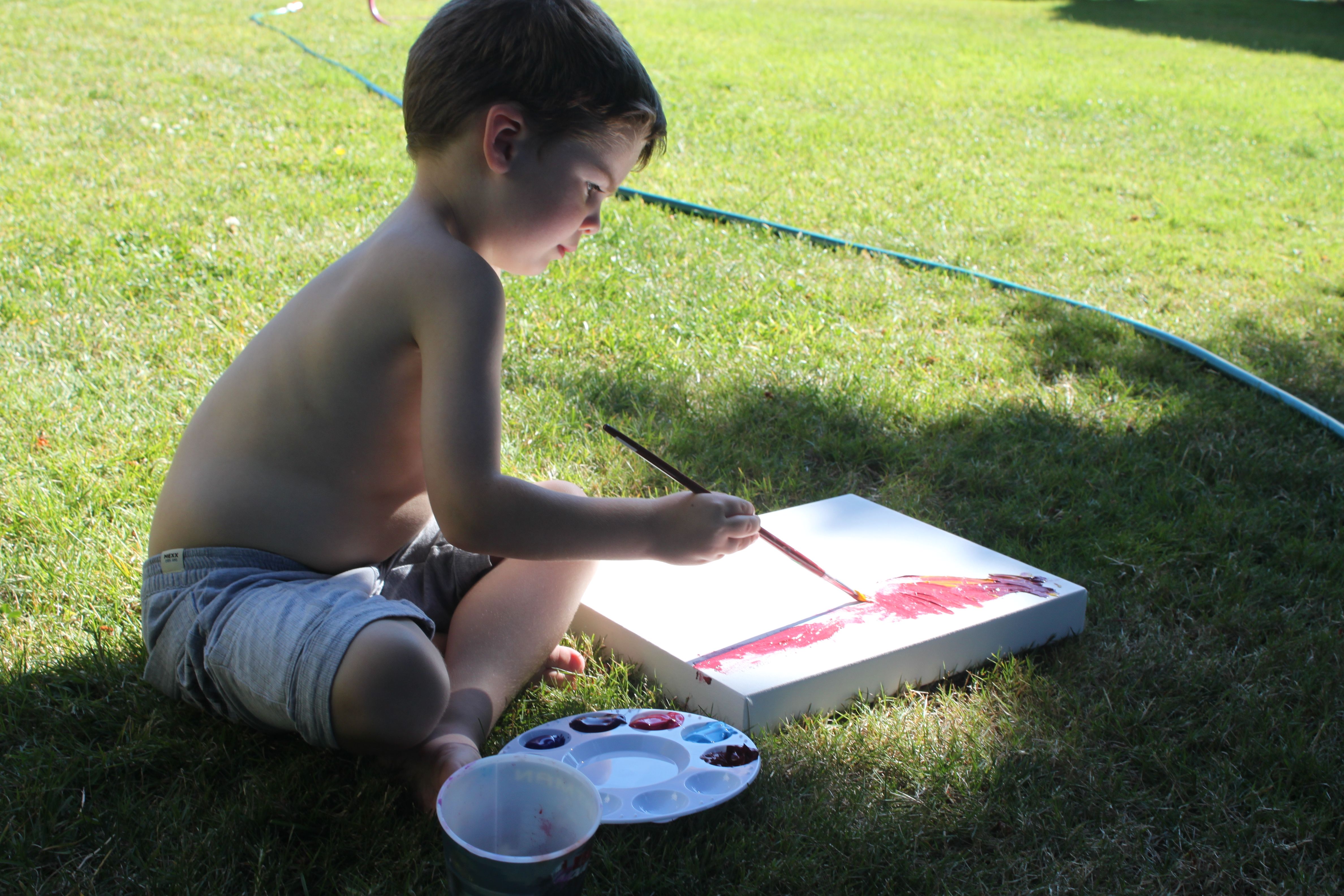 Before going to visit, we set our kids up with bigger canvasses in the yard.  With the only rule being the use of  their Grandmother’s five favorite paint colours as ammunition – they each set out painting their masterpiece.  They used brushes, sponges, fingers… and a foot at one point!  It was so cool to see how different each of them was in their approach.  With no fears of making a mess (who cares? we hosed them off after) or of rules of what or how to paint – they each took their own – very different path.