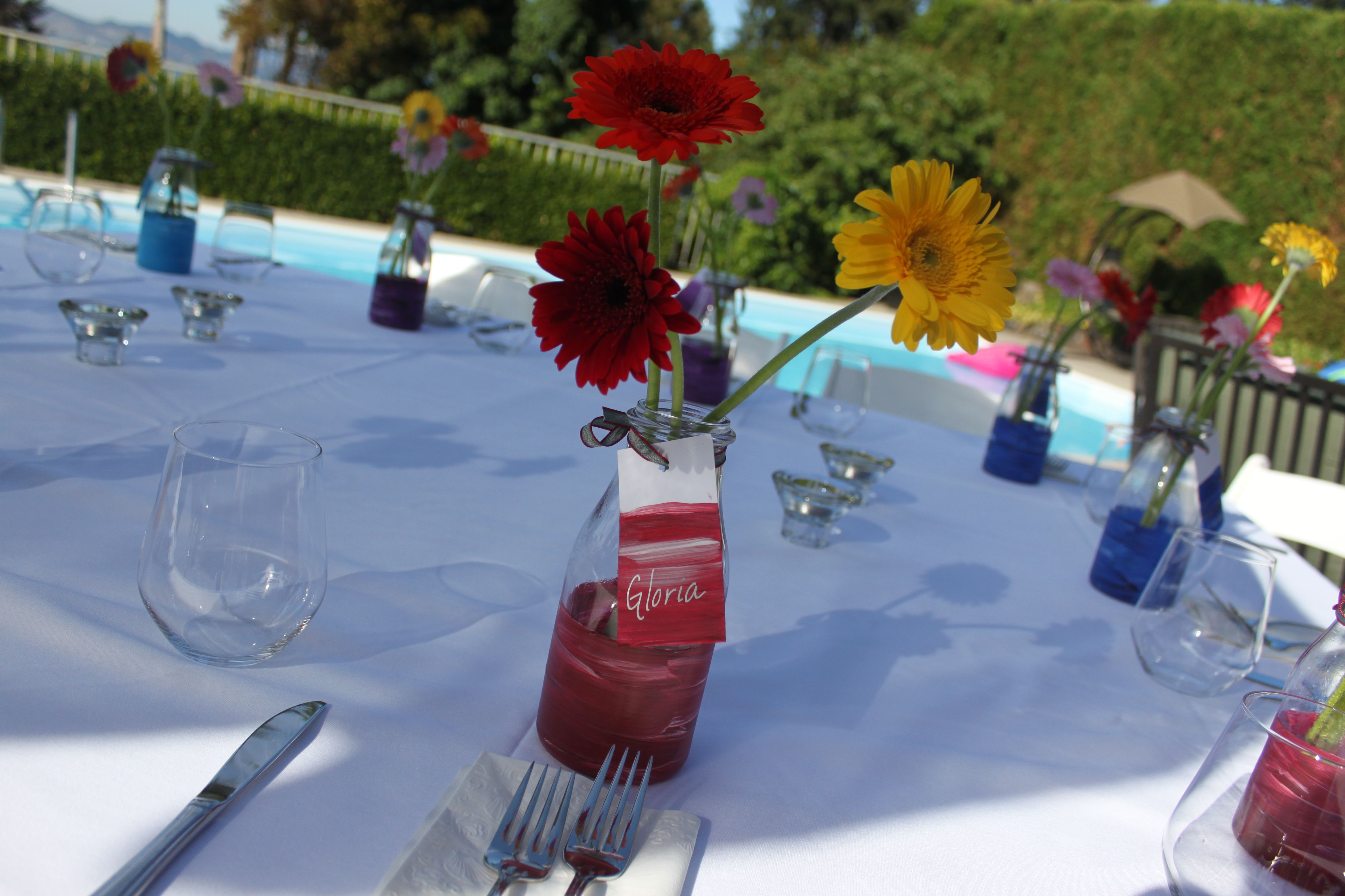 On the night of the party everyone took home their vase – which doubled as their take-away and a place setting … and held the flowers for the place settings.